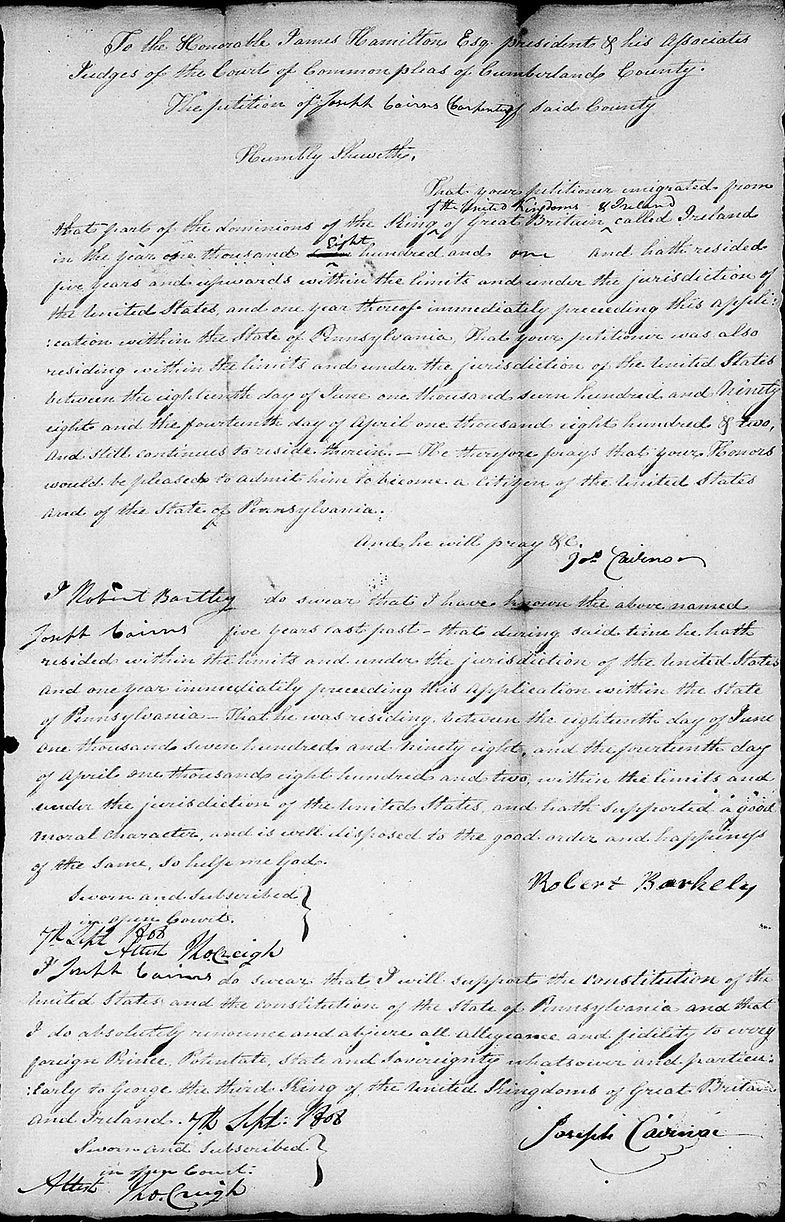 Joseph Cairns, carpenter, immigrated from Ireland to Cumberland Co., PA in 1801.