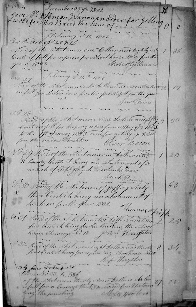 Robert Gilmore, 1803 payment for repairs on Jaffery schoolhouse.