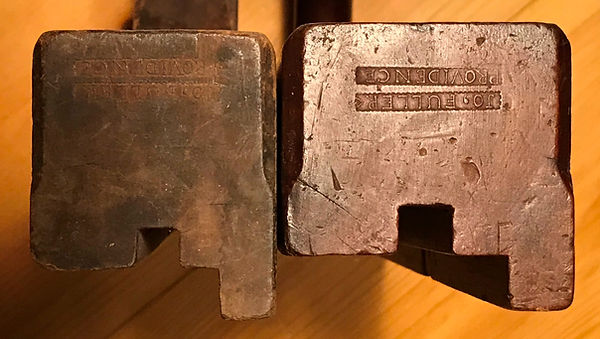 Bench planes. Comparison of wedge abutment chamfers. Top to bottom: A / C imprint (cheek 2 3/4"), C imprint (cheek 1.6"), D1 imprint (cheek 1 3/4").