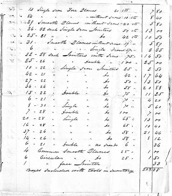 A search through probate records yielded Samuel Sr.'s will and inventory from 1842. The inventory included a significant section of fore, jointer and smooth planes with and without irons. In addition, planes with irons were further itemized as having either single or double irons. Interestingly, the inventory included only bench planes.